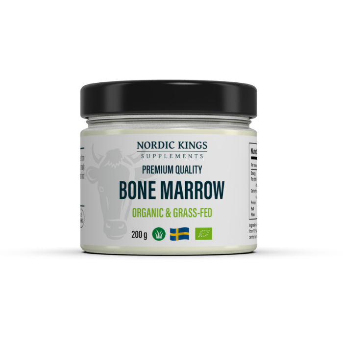Ekologista luuydintä ruotsalaisesta ruohoruokitusta naudasta. Ruohoruokitun naudan luuydin on sekä luomua että KRAV-sertifioitua. Se on peräisin eläimistä, jotka on kasvatettu 100 % ruoholla ja yrteillä. Eläimille syötetään 0 % viljarehua (soijaa, vehnää, maissia). Ekologinen Ruohoruokitun naudan luuydin on puhdasta rasvaa, jossa on terveellisiä rasvahappoja, runsaasti luonnollista E-vitamiinia sekä kollageenia, glysiiniä, glukosamiinia ja kondroitiinia.